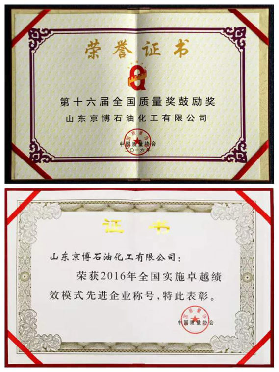 会议现场隆重举行了2016年度全国质量奖颁奖仪式,经过全国质量奖评审活动领导小组和评审委员会的审核,京博石化荣获全国质量奖鼓励奖。这是京博石化继2014年获得山东省省长质量奖提名奖、2015年获得全国实施卓越绩效模式先进企业之后获得的又一质量奖殊荣。这标志着山东京博石油化工有限公司管理水平和管理理念的不断提升,是对公司追求卓越的管理,经营管理理念和方法的肯定,也为企业向社会提供优质的产品和服务提供了强有力的保障。