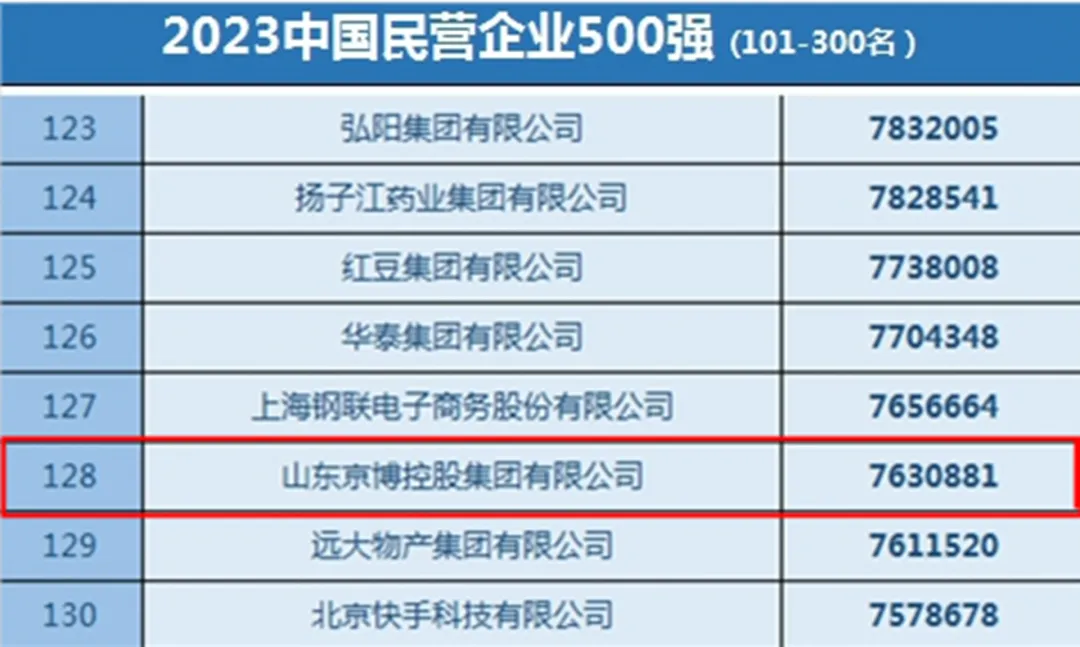 民营经济是推动中国式现代化的生力军,9月12日,由全国工商联、山东省人民政府共同主办的“2023中国民营企业500强峰会”在济南召开,会上发布了“2023中国民营企业500强”榜单。山东京博控股集团有限公司荣登榜单,位列第128位,排名较去年上升6位。